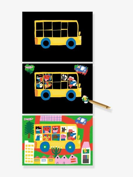 Pour les tout petits, voici 5 grands tableaux à gratter, sur le thème des véhicules, avec un gros bâtonnet en bois adapté pour les plus jeunes enfants dès 18 mois. A l’aide des 2 côtés du bâtonnet, l’enfant gratte la surface de la carte pour faire des traces et découvrir des surprises, quel plaisir ! Et même si, emporté dans son élan, il a envie de tout gratter, le résultat sera joli aussi.