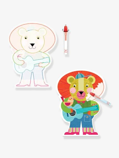 - Contenu : 4 planches illustrées et silhouettées en plastique souple avec une zone blanche qui disparait, un crayon à reservoir d’eau et 1 support en carton épais.