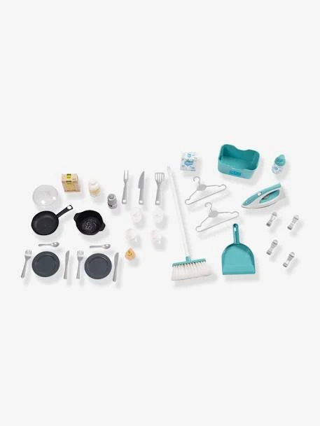 Pour un maximum de fun, la cuisine Clean Tefal est vendue avec de nombreux accessoires dont 1 poêle, 1 grappe BBQ, 1 casserole, 2 tasses, 2 verres, 2 assiettes, 2 couteaux, 2 fourchettes, 2 cuillères, 3 capsules à café, 1 salière poivrière cric crac, des boites factices, 1 balai, 1 pelle, 2 cintres, 4 pinces à linge et 1 fer à repasser avec des fonctions mécaniques.
