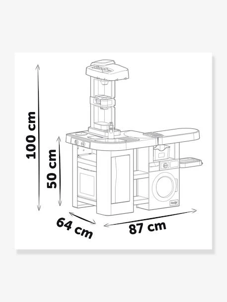 La cuisine Clean Tefal est le jeu d’imitation par excellence ! Cette cuisine incluant un espace ménage plaira sans aucun doute à vos enfants qui pourront jouer seuls ou entre copains. Plusieurs espaces ont été imaginés pour faire durer le jeu : évier avec robinet, four, frigo, hotte, machine à café, machine à soda, plaque de cuisson avec fonctions sonores… Mais la cuisine comporte également une machine à laver avec porte ouvrable et tiroir contenant 2 compartiments pour la lessive et l’adoucissant. Une fonction cric crac permet de programmer le cycle de lavage ! Vos enfants pourront également y retrouver un étendoir, une panière à linge ainsi qu’une table à repasser.
