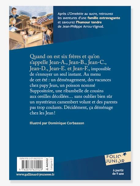Quand on a six frères et qu’on s’appelle Jean-A., Jean-B., Jean-C., Jean-D., Jean-E. et Jean-F., impossible de s’ennuyer un seul instant. Au menu de cet été : un déménagement, des vacances chez Papy Jean, un poisson nommé Suppositoire, une ribambelle de cousins aux oreilles décolées… sans oublier bien sûr un mystérieux camembert volant et des parents pas trop coulants.