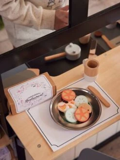 - Aliments : 2 tranches de tomates, concombre, champignons, crevettes, 4 cartes de menus, des stickers, des ustensiles de cuisines (spatule + couteau) 2 sets de couverts (fourchette, couteau) une caisse avec cadran à craie + un appareil CB et une carte bancaire, sel, poivre