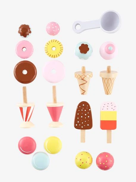 Un set de glacier en bois qui permettra aux enfants de s’improviser marchand de glaces le temps d’un instant ! Esquimaux, cornets, macarons givrés ou simples boules glacées, ils auront le choix entre différentes glaces à servir avec les accessoires fournis. Les cornets et coupes glacées se combinent selon les envies de chacun !